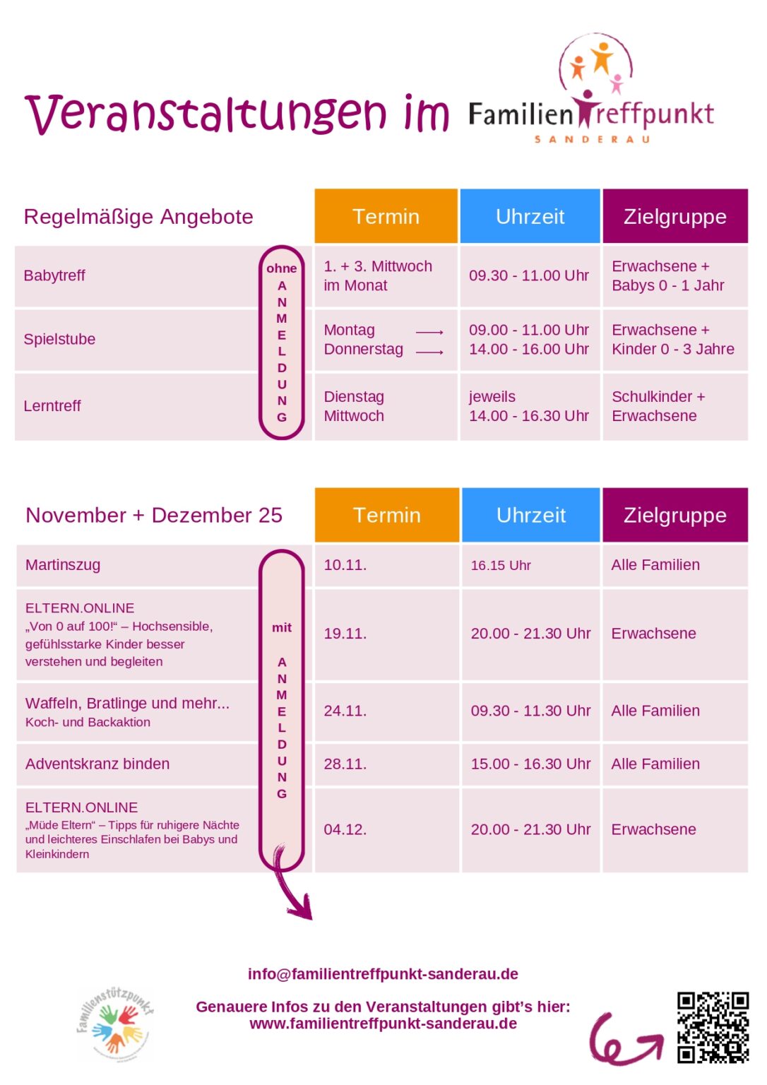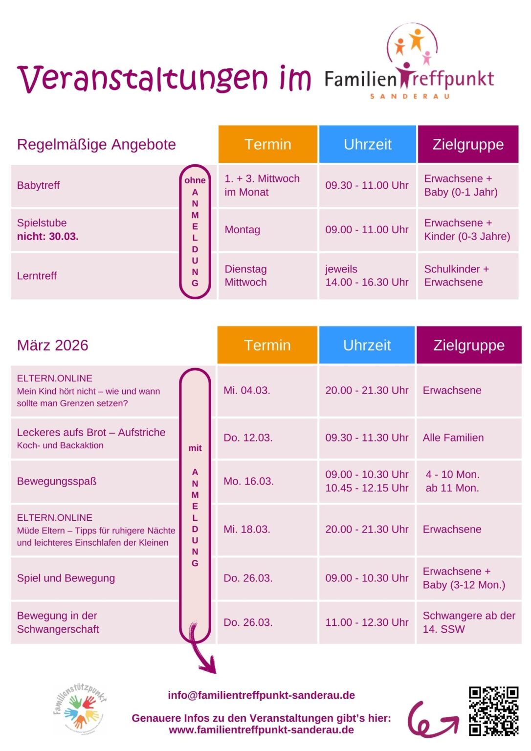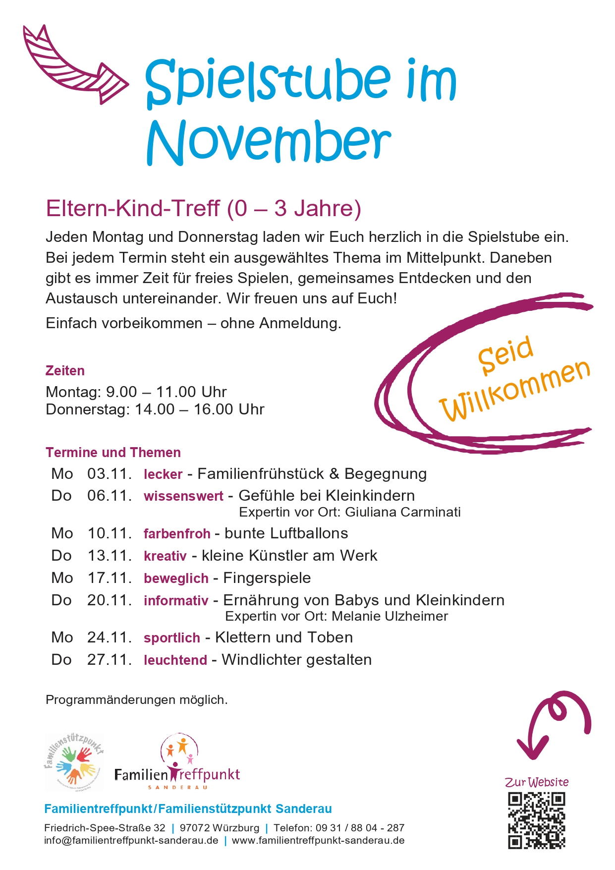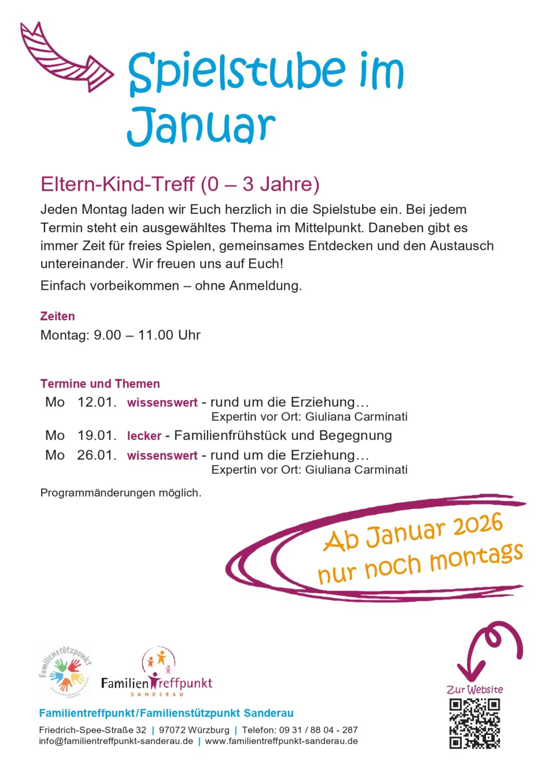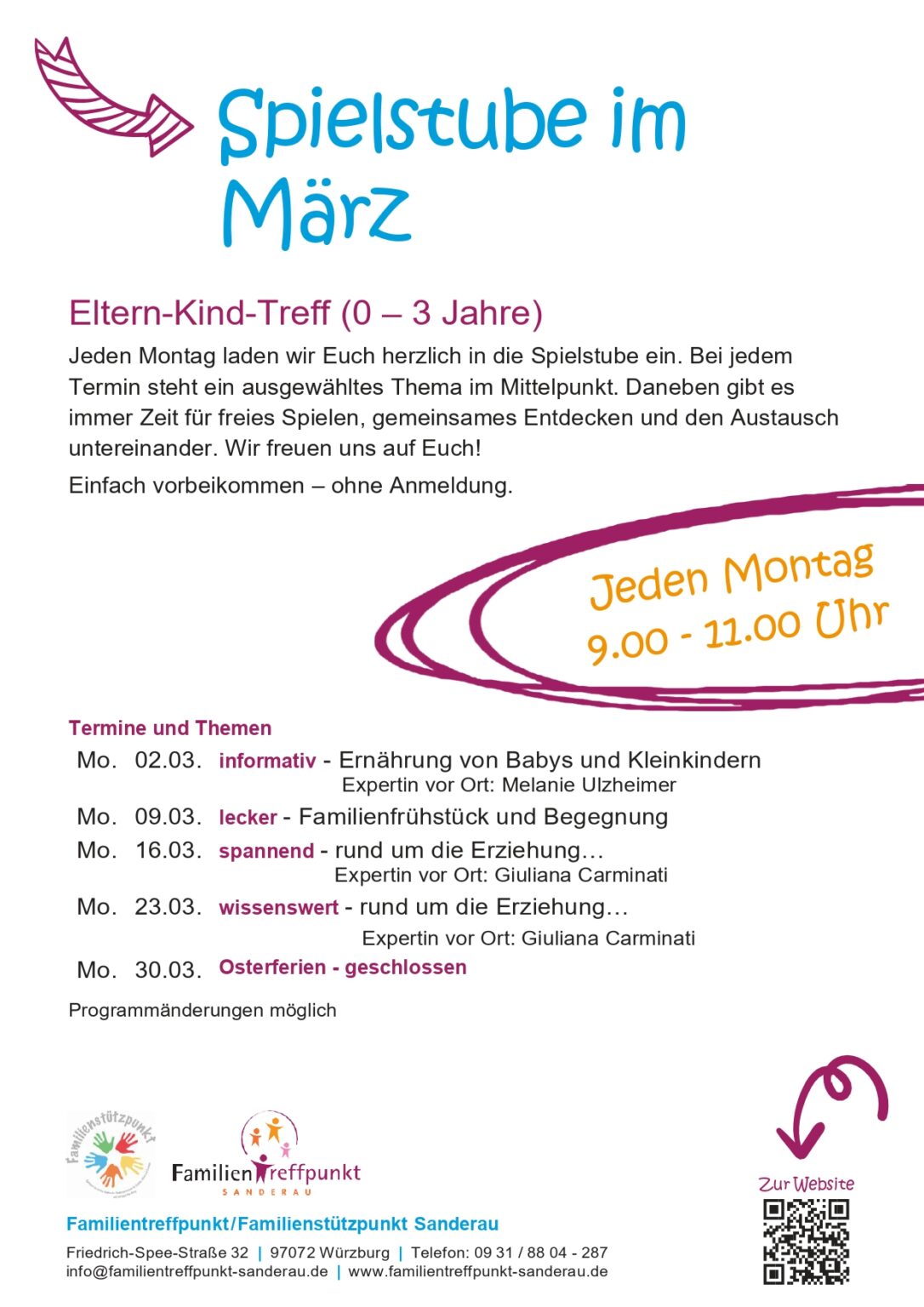 Seine Aufgabe ist es, Familien im Stadtteil zu unterstützen und durch verschiedene Angebote zu entlasten. Der Familientreffpunkt steht allen Familien mit Kindern offen und organisiert zahlreiche niedrigschwellige Angebote. Eine weitere wichtige Funktion des Familientreffpunkts Sanderau ist die Vernetzung mit anderen Einrichtungen im Stadtteil.